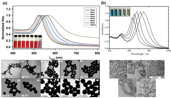 Absorbance spectra, photographs and TEM micrographs of gold nanospheres with different sizes (a) and gold nanorods with different aspect ratios (b). Adapted with permission from [7]. Copyright 2007 American Chemical Society; and adapted from [8] Copyright 2005 with permission from Elsevier, respectively.