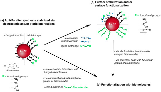 Schematic representation of surface stabilization and or functionalization of gold nanoparticles (Au NPs), followed by surface (bio)functionalization.