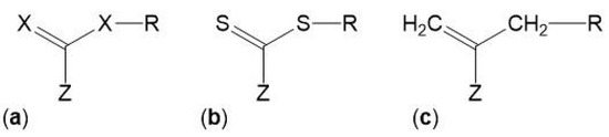 The control over the composition and architecture of RAFT polymers depends on the kinetics of the reaction and the elimination/minimization of radical-radical terminations which is due to the use of a chain transfer agent (CTA), also known as RAFT agent. The CTA, with the structure shown in Figure 5, confers a “living” character to the polymerization since it mediates the polymerization via a reversible chain-transfer process and its efficiency depends on the nature of the groups X, Z and R (Figure 5a). Although CTAs where X = CH2 (Figure 5c) have been used, the most efficient CTAs are thiocarbonylthio compounds (Figure 5b) [65,66,69].