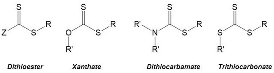 The most commonly used CTAs are the thiocarbonylthio compounds, with a general structure Z–(C=S)–S–R (e.g., dithioesters, xanthates, dithiocarbamates and trithiocarbonates—Figure 6), which have been used for the synthesis of different homopolymers and copolymers. Moad et al. 2005 and 2006 [65,66] summarized a wide range of these CTAs that were used until then, and Lowe et al. 2007 [70] focused on CTAs used in the synthesis of water-soluble copolymers.