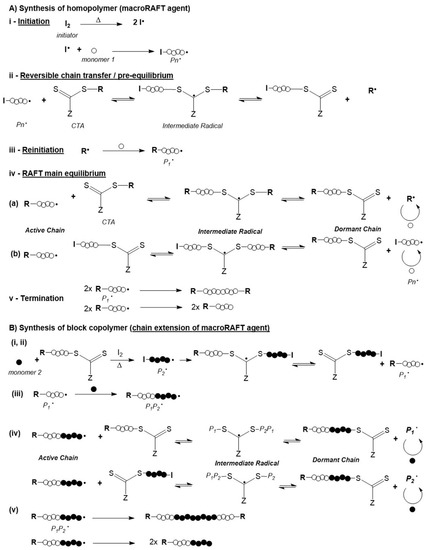 The molecular weight of the polymer chains and its distribution, the composition and the architecture of the resulting polymers can be controlled due to the fact that the termination step is minimized. Suppression, or at least significant reduction of termination is due to the equilibrium that is established between the propagating polymeric chains and a macroCTA, also named macroRAFT agent. The CTA is preserved in the chain giving a “living” character to the macrochain which can be extended by adding a second monomer, as illustrated in Figure 7B. In fact, the resulting macroCTA can be isolated and subsequently used in another batch under distinct reaction conditions, for instance aqueous medium [65,66,67,68].