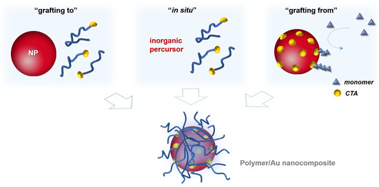 Regarding the three strategies schematized in Figure 8, all of them present advantages and disadvantages in the preparation of polymer/Au nanocomposites. The grafting to also referred as post-modification is the easiest and most straightforward methodology since each component is synthesized individually allowing control over the size and shape of the inorganic particle as well as the molecular weight, structure and composition of the polymer, and only afterwards are they mixed yielding the nanocomposite [1,68]. However, in this strategy, limited grafting density can be an issue, especially for polymers with high MW [82]. As mentioned before, chemisorption of the previously-prepared polymer onto Au NPs can be promoted through the thiol group, by removal of the RAFT agent [83,84,85,86,87] or can be carried out maintaining the RAFT agent (di- or tri-thio group). For example, hydrophilic polymers prepared by RAFT polymerization have been used to coat Au NPs. For instance, Davis et al. [88] 2010, reported the stabilization of previously prepared Au NPs (d = 20 nm) using temperature and pH responsive polymers prepared via RAFT polymerization: poly(2-aminoethylmethacrylamide) (PAEA), poly(acrylic acid) (PAA), poly(N,N-dimethylaminoethyl acrylate) (PDMAEA), poly(oligoethylene oxide) acrylate (P(OEG-A)), poly(oligoethylene oxide acrylate-co-diethylene oxide acrylate) (P(OEG-A-co-DEG-A)) and poly(N-isopropyl acrylamide) (PNiPAM). Only the cationic polymers required special care during mixing with Au NPs to avoid aggregation due to the interactions with the citrate anions at the Au NPs surface. Destarac et al. coated Au NPs (d = 8 nm) with three polymers prepared by MADIX/ RAFT polymerization which in aqueous solutions have different behaviors: a cationic polymer, poly[(3-acryl-amidopropyl) trimethylammonium chloride] (PAPTAC), a thermoresponsive polymer PNiPAM, and a pH-responsive polymer PAA [89], and also reported the used of poly(N-vinyl caprolactam) [55], which is also a thermoresponsive polymer. The optical properties of the resulting nanocomposites changed by varying the pH and/or temperature of the colloids depending on the polymer used. Klok et al. [90] in 2010 prepared Au NPs with different sizes from 5 to 47 nm which then were coated, in aqueous solution, with poly(poly(ethylene glycol)methacrylate) (Mn = 16,800 g/mol) and demonstrated thermoresponsiveness. Klok et al. in 2011 [91] prepared a library of Au NPs (12, 28 and 51 nm) coated by post-polymerization modification of poly(pentafluorophenyl methacrylate) synthesized via RAFT polymerization with different chain lengths. This post-polymerization modification allowed the preparation of nanocomposites with different surface chemical functionalities (e.g., charge, polarity) and used them as optical sensors to study several biologically relevant media. In 2013, Vana et al. [92] coated Au NPs (d = 14 nm) with PNiPAM containing single or multiple trithiocarbonate (TTC) groups. The authors demonstrated that the TTC groups play an important role binding to the gold core, thus providing stability to the nanocomposite. Interestingly, using polymers with multiple TTC groups, the distance between the Au cores was kept constant even when polymers with higher MW were used. Vana’s group has also been working on the grafting to approach to prepare other controlled nanostructures with Au [93,94].