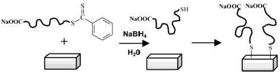 Back in 2003 McCormick et al. [80] have reported the immobilization of polymers prepared by RAFT polymerization onto gold films. After the preparation of the polymers, poly(sodium 4-styrenesulfonate), poly((ar-vinylbenzyl)trimethylammoniumchloride), poly(N,N-dimethyl-acrylamide), and poly(3-[2-(N-methylacrylamido)-ethyldimethyl ammonio] propane sulfonate-b-N,N-dimethylacrylamide), the authors reduced the dithioester end group of the CTA to thiol using NaBH4. Then the thiol containing polymers were immobilized onto gold surfaces due to the high affinity of thiol to gold, as depicted in Figure 9.