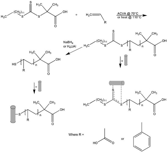 The surface of gold nanorods bearing polymers prepared via RAFT was reported by Boyes et al. in 2007 [95]. Gold nanorods (AR = 10) were firstly synthesized and subsequently modified with hydrophilic polymers poly(2-(dimethylamino)ethyl methacrylate) (PDMAEMA) or poly(acrylic acid) (PAA), in aqueous solution, and with the hydrophobic polymer (polystyrene—PS) in DMF. The authors demonstrated that the polymers were grafted to the Au nanorods surface by the di- or tri-thio group of the RAFT agent without the need to reduce these groups to the corresponding thiol. Figure 10 illustrates the synthetic procedure as well as the different coordination modes.