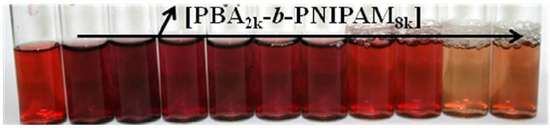 Image of the final NPs solutions 5 min after reduction at 20 °C. The polymer concentration increases from left to right (0 to 0.15 wt %). Reprinted with permission from [96]. Copyright 2010 American Chemical Society.