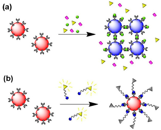 Several biosensors envisage the identification of biomolecules, such DNA and proteins, that result from aggregation of Au NPs induced by specific molecular recognition, thus shifting the LSPR band, a phenomenon that in certain cases can be observed by visual inspection. Hence, colloidal Au NPs that are well dispersed in water present a characteristic color, but when aggregated induce color changes, typically from red to purple-blue, depending on the particle aggregation state [58,128,129,130,131] Figure 13a shows a schematic representation of Au NPs as a biosensing platform based on the LSPR. Regarding biosensing based on fluorescence quenching, receptor/ligand binding and release events can be monitor through changes in fluorescence intensity or lifetime of the fluorophore, reflecting binding and unbinding states of analytes to sensors, since the fluorescence intensity is dependent on the distance between the Au NP (quencher) and the fluorophore [16,125,131,132,133,134,135,136] (Figure 13b).