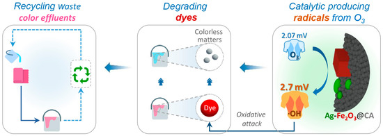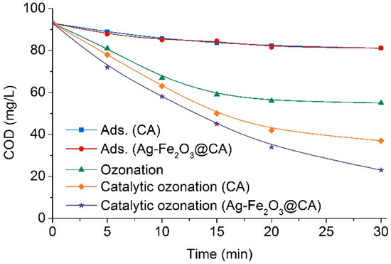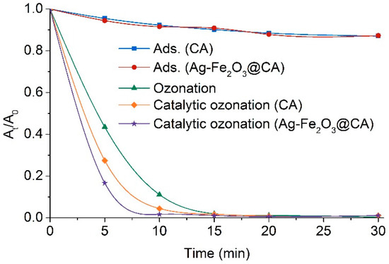 According to Figure 9, close attention has to paid to the adsorption property of the catalyst materials. Previously, it has been understood that porous catalysts would remarkably strengthen color removal by physical adoption [34,35]. Notwithstanding, in the two reference processes (denoted as Ads. (CA) and Ads. (Ag–Fe2O3@CA)) which were only provided with O2 rather than O3, no more than 10% color reduction was detected in the first 15 min. The possible reason might be that the colorant in the commercial dye product has a relatively larger size than that of mesopores presented in CA or Ag–Fe2O3@CA. Another possibility was that, within the first 15 min, or even the total 30 min, neither CA nor Ag–Fe2O3@CA had fully played their adsorption capability. These reasons also could explain that even though CA and Ag–Fe2O3@CA possessed distinct porosities, they had quite identical poor adsorption capacity to the probe dyes in effluents. Since as high as 28% of the initial color reduced in the first several minutes during the treatment, it can be assumed that the improved efficiency of color removal predominantly arose from chemical oxidation promoted by catalysts rather than direct physical adsorption.