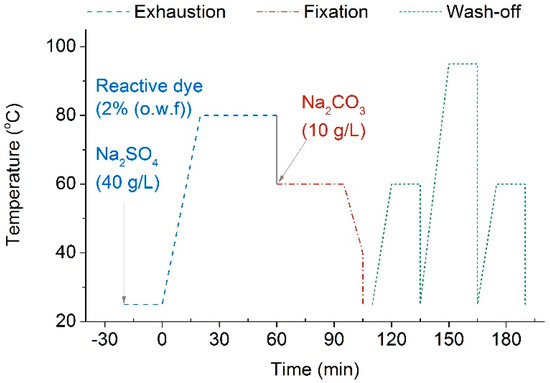 Dye exhaustion, dye fixation and wash-off experiments were all performed in the same dyeing machine (AHIBA IR™, Datacolor, Lawrenceville, NJ, USA). Firstly, naturally dried cotton fabrics (5 g/piece) after pre-treatment were separately soaked into 100 mL of dyeing baths, which contained 2% (o.w.f) reactive dye and 40 g/L Na2SO4. Then, the dyeing vessels were heated at 80 °C for 30 min for dye exhaustion. Soon after, fabrics were taken out of dyeing baths, which carefully added with Na2CO3 (10 g/L) in the absence of the fabrics. Afterwards, fabrics were re-immersed into dyeing baths containing Na2CO3, and kept at 60 °C for another 30 min for dye fixation. Eventually, fabrics were transferred from the water baths and padded by a horizontal padder to maintain 60% wet pick-up prior to the wash-off step. The entire dyeing curve can be found in Figure 2.
