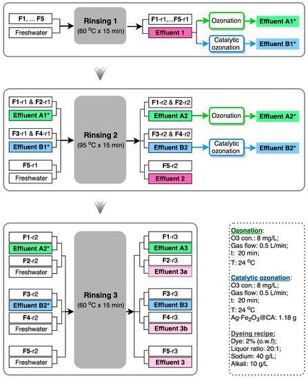 The flow chart of rinsing processes in the wash-off step is illustrated in Figure 3. Rinsing essays were performed 3 times for 5 groups of fabrics (F1, F2, F3, F4, F5). Each group has different treatment procedures, wherein F5 was selected as the reference group and was rinsed with freshwater in all of the rinsing processes. In Rinsing 1, all of the fabrics were cleaned with freshwater at 60 °C for 15 min, obtaining fabric sample F1-r1, F2-r1, F3-r1 and F4-r1. The related color effluents collected were then treated by ozonation alone and catalytic ozonation with Ag–Fe2O3@CA, resulting in Effluent A1* and Effluent B1*. Subsequently in Rinsing 2, Effluent A1* was used to clean F1-r1 and F2-r1 at 95 °C for 15 min to obtain fabric sample F1-r2 and F2-r2, and the resulted Effluent A2 was thereafter treated by ozonation alone to obtain Effluent A2*; likewise, Effluent B1* was used for cleaning of F3-r1 and F4-r1 to obtain fabric sample F3-r2 and F4-r2, and the resulted Effluent B2 was converted to Effluent B2* at the end by catalytic ozonation with Ag–Fe2O3@CA.