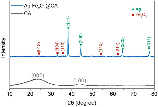 XRD patterns of Ag–Fe2O3@CA and pure CA are presented in Figure 4. For pure CA, the broad peaks located at 23° and 43°, which can be found in numerous carbon materials, were associated to the (002) and (100) planes of amorphous carbon and [30]. For Ag–Fe2O3@CA, the characteristic peaks at around 38°, 45°, 65° and 78° well matched up to the (111), (200), (221) and (311) planes of the face-centered cubic Ag in sequence according to the JCPDS File 04-0783 [31]. In addition, the (012), (104), (110), (116) and (214) lattice planes, which were observed at around 24°, 33°, 36°, 54° and 63° respectively, could be ascribed to the diffraction from α-Fe2O3 according to ICDD #01–079–0007 [32]. Last but not least, the diffraction peaks of Ag–Fe2O3@CA were all narrow and sharp, confirming that both Ag and α-Fe2O3 were of high crystallization.