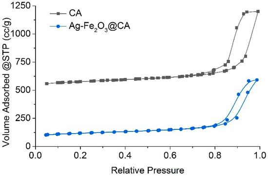 The N2 adsorption and desorption performances of CA and Ag–Fe2O3@CA are illustrated in Figure 7. Both of the two materials exerted IV isotherm patterns, which showed an obvious hysteresis loop at higher relative pressure. This suggested mesoporosity, as well as macroporosity, existed in both of these two materials [33]. This could be ascribed to the fact that the hosting material CA contained networks which generated from the agglomeration of nano-sized carbon particles (see Figure 5b).