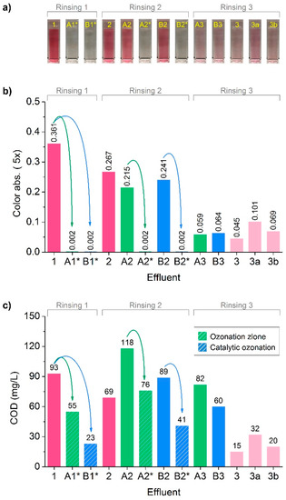 Catalytic ozonation of Effluent 1 was the first reclamation step for recycling of the waste effluents. Next, the reclaimed effluents will be reused as the rinsing medium to clean fabrics, followed by catalytic ozonation treatment again to degrade the new stripped dyes from the latest rinsing process. This reclamation–rinsing process cycle will be repeated twice to complete the total 3 rinsing processes in the wash-off step. The fate of effluents and the related fabrics has been illustrated in detail in Figure 3. During the entire recycling process, water quality of selected effluents was evaluated by color and COD. Effluent samples from three rinsing processes (Rinsing 1, Rinsing 2 and Rinsing 3) after 5 times dilution were arranged in sequence from the left to the right in Figure 12a, and the corresponding color absorbance and COD were demonstrated in Figure 12b,c.
