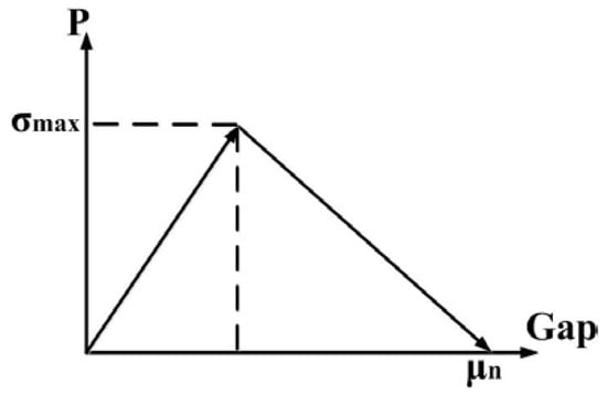 The coordinates of the particles are generated randomly within the range of a cube whose length is 80 μm. Contact elements are built up between phosphor particle and silicone. The adhesion behavior between particles and silicone is described by a cohesive zone material, which is based on the model proposed by Alfano and Crisfield [16]. It’s assumed that the separation mode of the interface surface normal to the interface dominates the slip tangent to the interface. The normal contact stress and contact gap behavior are plotted in Figure 6. The area value below the lines is equal to fracture energy. When the tensile stress reaches the value σmax, debonding of the interface starts, until the contact gap runs up to μn. The value of max normal stress σmax is set at 0.3 MPa, and the ultimate distance of the gap μn is 0.5 μm.