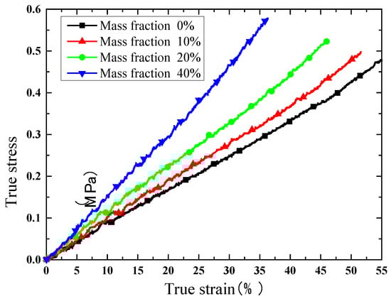 True strain versus stress curves at different mass fractions of phosphor with a strain rate of 8 × 10−4 s−1 and no aging.