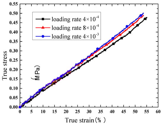 True strain versus stress curves of pure silicone at different loading rates (aging time: 0 h, mass fraction: 0%).