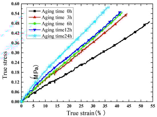 True strain versus stress curves at different aging times (strain rate: 8 × 10−4/s, mass fraction: 0%).