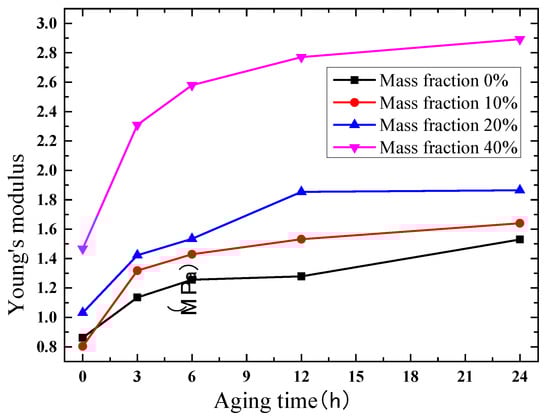 Due to the satisfactory elongation characteristic, true stress and true strain curves are extracted for comparison. The results of the compression test are shown in Figure 8, Figure 9, Figure 10 and Figure 11. Figure 8 indicates that the phosphors in the silicone stiffen the silicone matrix significantly. This is caused by the stiff particles embedded in the silicone. The properties of pure silicone at different loading rates are shown in Figure 9; the pure silicone material exhibits a slightly rate-dependent characteristic, which can be neglected below a strain rate of 4 × 10−3 s−1. The slope of the line at a loading rate of 4 × 10−3 s−1 is slightly larger than those at lower loading rates. Aging time has a great influence on the performance of the pure silicone; as shown in Figure 10, the Young’s modulus of the silicone increases significantly with aging time. This property of silicone could cause severe reliability issues in actual application, such as serious stress conditions and cracks in the material. The Young’s modulus of phosphor/silicone composite at strain rate of 8 × 10−4 s−1 is clearly shown in Figure 11.