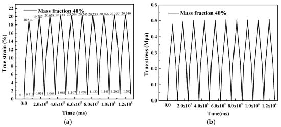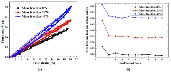 Figure 12 shows the measured strain rate for 4 × 10−3 /s and 20 °C room temperature for the samples whose mass fraction was controlled at 40%. The voice coil motor carries out a return motion when zero force is detected. It can be seen that the true strain is unable to return to zero, which means plastic strain has occurred. The energy stored in the composite has been consumed by the compression test. In Figure 13, ten compression cycles are applied to the samples, indicating the viscoelasticity of the silicone; this type of material will absorb the strain energy, and its stress will postpone strain. Figure 13b shows the values of areas between the load and unload curves versus load/unload times. After the first load and unload, the areas drop obviously to a stable level. This phenomenon can be explained by the debonding of the interface between particle and silicone matrix. Once debonding behavior occurs, it is barely able to return to the initial state. In the simulation, the forces between the interfaces are taken into consideration. Thus, it can be concluded that the material presents a progressive accumulation of plastic deformation.