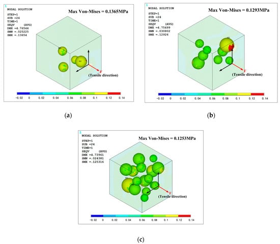 Von-Mises stress distribution of the phosphors/silicone composite: (a) mass fraction of 10%; (b) mass fraction of 20%; (c) mass fraction of 40%.