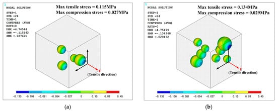 All the simulation models are in same loading condition for comparing the effect of mass fraction. Tensile direction is shown in Figure 15 and Figure 16, and strain is controlled at 0.1 to avoid significant deformation of grid, which could cause difficulties in convergence. The opposite side of the cell is fixed in all direction. The Von-Mises stress distribution of the phosphors/silicone composite is shown in Figure 15; it can be seen that maximum stress decreases with the increase of mass fraction because fewer particles lead to stress concentration in the silicone matrix. When the number of particles increases, the composite becomes more uniform. As to the phenomenon of weak tensile performance, a reasonable explanation is that greater interface between particles and silicone causes defects in structural integrity. This result is consistent with the experimental observation based on the tensile test. Additionally, the maximum stress always occurs on the largest particle’s surface perpendicular to the extruded direction. When the tensile stress reaches a certain value, debonding behavior—which means a separation between the particles and the silicone matrix—will occur. Figure 15 shows the contact pressure; a negative value means that the interface between the particle and the silicone matrix experiences tensile stress. On the contrary, a positive value indicates that the interface experiences compression stress. As shown in Figure 16, the surfaces of the particles perpendicular to the extruded direction experiences tensile stress; meanwhile, the loop surface, which is the red region shown in Figure 16, experiences compression stress. Tensile stress, which could cause debonding of the interface, is 0.115, 0.134 and 0.118 MPa, respectively, for the corresponding mass fractions of phosphor of 10%, 20% and 40%, when the material’s engineering strain reached 10%. The stress condition on the interface gets worse when the mass fraction of the phosphor increases; as a result, elongation of the composite is weakened, which is consistent with the experiment shown in Figure 14.