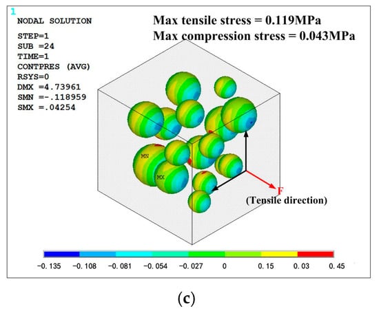 Contact stress between particles and silicone: (a) mass fraction of 10%; (b) mass fraction of 20%; (c) mass fraction of 40%.