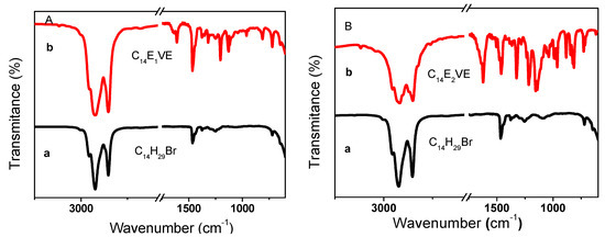 FTIR spectra of C14E1VE (A) and C14E2VE (B): C14E29Br (a) and corresponding C14EnVEs (b) (n = 1, 2).