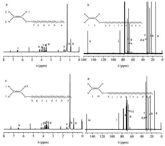 1H NMR spectra of C14EnVEs (a,c) and 13C NMR spectra of C14EnVEs (b,d) (n = 1, 2).