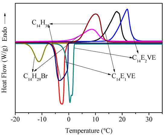 DSC curves of C14EnVEs, C14H30, and C14H29Br.