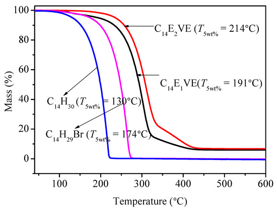 Figure 4 presents the TGA curves of C14EnVEs, C14H30, and C14H29Br. It can be seen that when the terminal hydrogen atoms of n-tetradecane were replaced by other groups, the thermal stability of the corresponding materials increased as the volume of the substituent increased. According to the references, the thermal stability of the experimented materials was characterized by the initial thermal decomposition temperature T5wt %, when the weight loss rate of materials reached 5%. The T5wt % of C14H30, C14H29Br, C14E1VE, and C14E2VE were 130, 174, 191 and 214 °C, respectively.