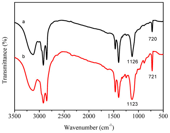 The FTIR spectra of PC14EnVEs are shown in Figure 5. No peaks appeared near 1621 cm−1 in the spectra of PC14EnVEs, which suggested that the double bonds changed to single bonds. From the FTIR spectrum of PC14E1VE (a), the single ether bond at 1126 cm−1 replaced the sharp bands at 1204 and 1126 cm−1 for C14E1VE, and the band in the spectrum of PC14E2VE (b) at 1123 cm−1 also replaced the bands at 1216, 1156, and 1141 cm−1 for C14E2VE. These results proved that the cationic polymerizations were successfully completed. The characteristic absorption band at 720 cm−1 was attributed to the rocking vibrations of (CH2)n groups (n > 4) in PC14EnVEs, which indicated that the crystal form of the alkyl side chain was changed from the orthorhombic crystal in the monomers to the hexagonal crystal in the polymers.
