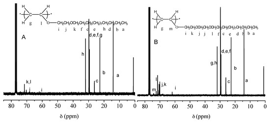 Figure 6 shows the 13C NMR spectra of PC14E1VE and PC14E2VE. Taking PC14E2VE as an example, it was easily determined that the chemical shift values of C=C changed from 86.5 ppm (l) and 151.8 ppm (m) to 31.9 (g) and 74.1 (m), by comparing Figure 2d and Figure 6. The chemical shift values of other carbon atoms in the side chains showed almost no change.