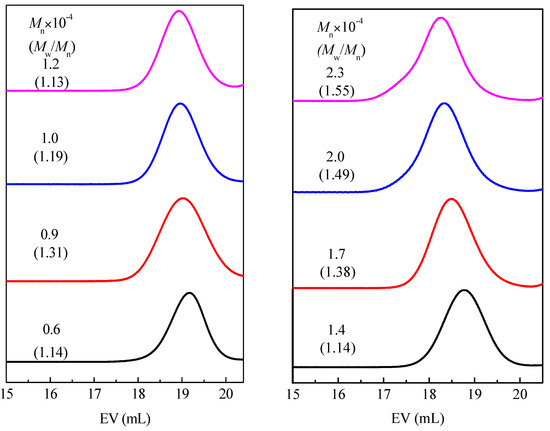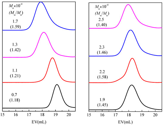 In order to systematically study the influence of the number average molecular weight on the phase transition enthalpy of homopolymer type phase change materials, a series of comb-like homopolymers with different molecular weights used as phase change materials were prepared by living cationic polymerization. The number average molecular weight (Mn) and molecular weight distribution (MWD) of a series of PC14E1VEs and PC14E2VEs with various molecular weights are shown in Figure 7 and Figure 8, respectively. These polymers PC14EnVEs (n = 1, 2) were measured using gel permeation chromatography (GPC) in THF at room temperature. The results are listed in Table 2.