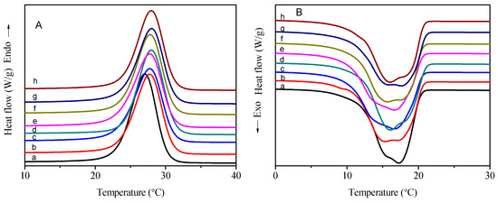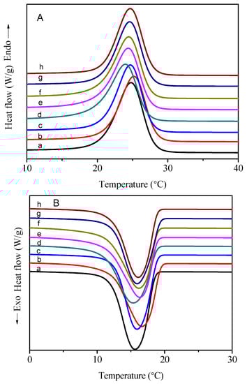 DSC thermograms of PC14E1VEs: (A) heating curves and (B) cooling curves.