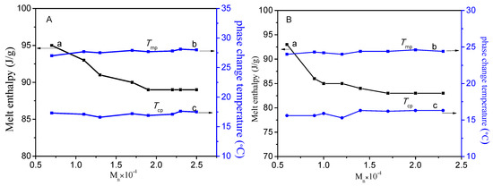 Melt enthalpy (a) and phase change temperatures (b, c) vs. molecular weights of PC14E1VEs (A) and PC14E2VEs (B).