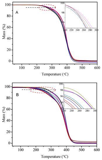 The thermal stability of PC14EnVEs was important in thermal energy storage applications, and the thermal degradation temperature of PCMs (Td) was one of the key parameters for determining the practical environment and processing techniques. Here, according to the references, we selected the temperature at which the weight loss rate of materials was 5% as the initial thermal decomposition temperature T5wt %. The TGA curves of PC14E1VE (A) and PC14E2VE (B) with various molecular weights are shown in Figure 12. It was clear that the T5wt % of PC14E1VEs and PC14E2VEs increased from 264 to 287 °C and from 228 to 286 °C, respectively, when the number average molar mass increased. Because the interactions between molecules gradually increased, the intertwining phenomenon became more and more obvious, resulting in fewer and fewer defects in molecules, and the thermal stability of the polymer gradually increased with the increase of the molecular weight of the polymers. These results indicated that the increase of polymers’ molecular weights can improve the thermal stability to a certain extent.