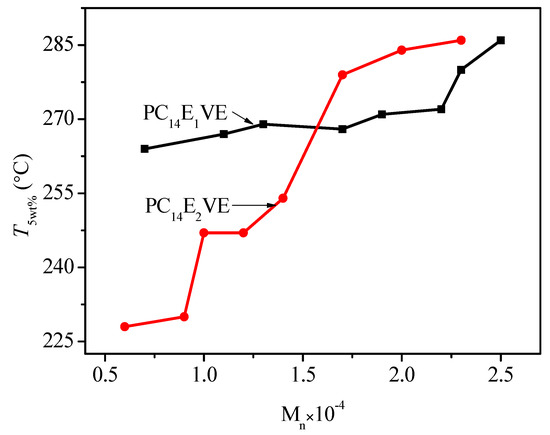 To determine a clear relationship between T5wt % and the number average molar mass of PC14EnVEs, the relationship lines of T5wt % and molecular weights are plotted in Figure 13. With the increase of molecular weights, the thermal stability of PC14EnVEs steadily improved.