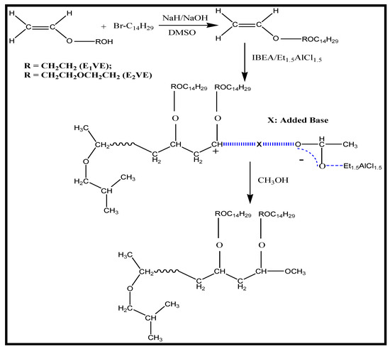 1-Bromotetradecane (C14H29Br) and n-tetradecane (C14H30) were purchased from TCI and used as received. Ethylene glycol mono-vinyl ether (E1VE) (TCI; >95.0%), diethylene glycol mono-vinyl ether (E2VE) (TCI; >96.0%), and isobutyl vinyl ether (IBVE) (TCI; >99.0%) were washed with a 0.1 M aqueous alkaline solution and then with water, and monomers were then distilled twice over calcium hydride and stored in a brown ampule under dry nitrogen in a refrigerator. Solvents and added bases (hexane, dimethyl sulfoxide, and ethyl acetate) were purified by the usual methods and distilled at least twice over CaH2 and metallic sodium (for hexane) just before use. Et1.5AlCl1.5 (Aldrich; 0.4 M in toluene) was used as supplied. 1-(Isobutoxy) ethyl acetate (CH3CH(OiBu)OCOCH3 (IBEA)), as a cationogen, was prepared by the addition reaction of isobutyl vinyl ether and acetic acid, and then IBEA was distilled over CaH2 under reduced pressure [18]. Sodium hydroxide (NaOH), aqua ammonia, dimethyl sulfoxide (DMSO), and diluted hydrochloric acid (HCl) were purchased from Tianjin Sailboat Chemical Reagent Co., Ltd., (Tianjin Guangfu Fine Chemical Research Institute, Tianjin, China) and used as received.