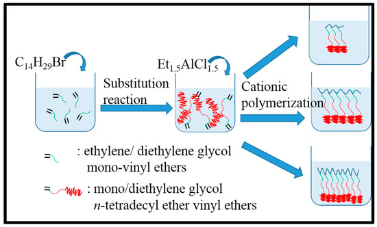 Monomers C14E1VE and C14E2VE were fabricated according to the methods of the published literature [19,20,21]. Taking the fabrication process of C14E1VE as an example, the experimental process was as follows: 6 g of NaOH was added to 200 mL of anhydrous dimethyl sulfoxide, and the mixture solution was stirred at 30 °C for 3 h under nitrogen atmosphere. Then, 0.1 mol of ethylene glycol mono-vinyl ether (E1VE) was added using a dry medical syringe, and the compounds were continuously stirred for 2–3 h, followed by the addition of 0.1 mol of 1-bromotetradecane under stirring using a dry medical syringe. The reaction was maintained for 48 h, and then the mixed solution was washed with deionized water. Next, the crude C14E1VE was purified by column chromatography elution with a solution of petroleum ether and ethyl acetate. The purified product was verified by 1H NMR, 13C NMR, and FTIR spectroscopy. The synthetic process of C14E2VE was similar to that of C14E1VE.