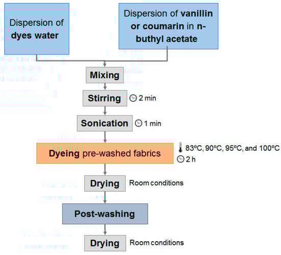 More recently, Carrión-Fite and Radei [14] proposed the use of more environmentally friendly dyeing auxiliaries based on o-vanillin or coumarin in an n-butylacetate co-solvent (an organic non-toxic solvent) for low molecular weight disperse dyes (C.I. Disperse Blue 56 and C.I. Disperse Red 73). The study confirmed that o-vanillin and coumarin had a positive and significant influence on dyeing behaviour of polyester in this system. At a temperature of 95 °C, the absorption levels of the fibres after 120 min were excellent: the content of Disperse Blue 56 dye absorbed by the PES in the presence of o-vanillin or coumarin was 97% and 96%, respectively. In the case of Disperse Red 73, the amount absorbed was 81% and 82%, respectively, for of o-vanillin or coumarin. Moreover, wash fastness was similar to the conventional process of dyeing polyester [14,15]. However, it was necessary to study more in depth the effect of the carriers by analysing the thermodynamic parameters and heat fastness, among others, to establish this new methodology. Moreover, another limitation of this study was that only low molecular weight disperse dyes were analysed.