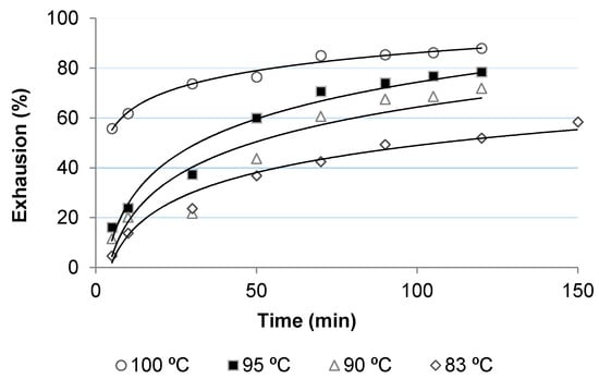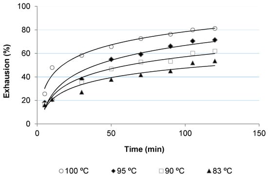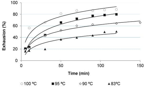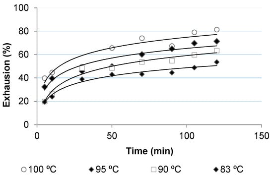 Concerning the dyeing with Disperse Blue 79, it was found that the initial dyeing rate with coumarin was significantly higher than for o-vanillin, except at 100 °C. However, after 60 min of the dyeing process, the PES fabric dyed in presence of o-vanillin presented a higher absorption level. At 100 °C, the values of exhaustion of PES fabric dyed with o-vanillin reached 87% after 120 min, which is similar to those achieved in the conventional dyeing process of polyester at 130–135 °C, as was mentioned above for Disperse Red 167.
