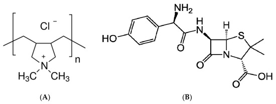 Chemical structure of polydiallyldimethylammonium chloride (PDADMAC) (A) amoxicillin (AMX) (B).