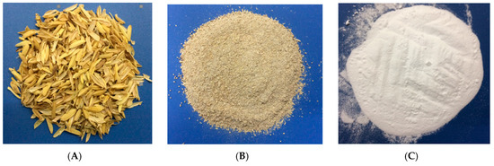 Pictures of (A) rice husk; (B) milled rice husk; and (C) synthesized nanosilica.