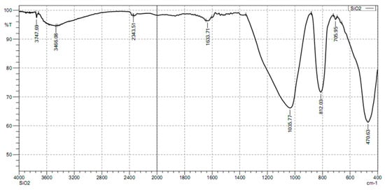 The FTIR spectrum of the nanosilica particles shown in Figure 4 indicates that the peaks at 1037.77, 812.03, and 470.63 cm−1 were due to the asymmetric, symmetric, and bending modes of SiO2, respectively [45]. The band at 3466.08 cm−1 and the peak at 1633.71 cm−1 for the sample are due to the –OH groups. These results confirm the existence of Si–O–Si stretch [32,45]. In addition, the FTIR spectrum of nanosilica revealed that unexpected peaks of any organic and inorganic compounds did not appear. In other words, the presence of silica is evident.