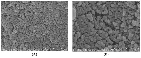 SEM images of SiO2 nanoparticles at different scales: (A) 500 nm; and (B) 300 nm.