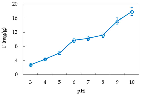 Effect of pH on PDADMAC adsorption on nanosilica. (Ci (PDADMAC) = 1.0 g/L, adsorbent dosage 10 mg/mL, 100 mM KCl). Error bars show standard deviations of three replicates.