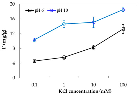 The effect of ionic strength on adsorption of PDADMAC onto nanosilica is clearly demonstrated on the isotherms (Figure 8). At pH 10, adsorption of PDADMAC increases with increasing ionic strength. The adsorption capacity of PDADMAC at 100 mM KCl is always higher than that at 10 mM KCl.
