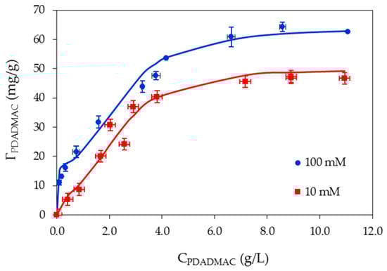 Adsorption is normally studied under isothermal conditions. For adsorption isotherms, Langmuir [36], Freundlich [37], and Brunauer–Emmett–Teller [38] models are often discussed. The Langmuir model is used to describe isotherms of some polymers at solid surfaces. However, these three models cannot be applied to polyelectrolyte adsorption. The two-step model proposed by Zhu et al. [39], with a general adsorption isotherm equation, was successfully applied to various types of adsorbates, including polyelectrolyte, for numerous systems [39,40,41]. Additionally, two-step kinetics could evaluate the growth of polyelectrolyte layers [42]. Thus, the two-step model can be used to fit adsorption isotherms of PDADMAC onto nanosilica.