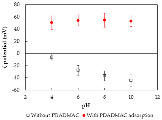 Zeta (ζ) potential measurement calculated from electrophoretic mobility is useful for evaluating the charging behavior of many nano- and micro-sized materials [50,51]. The ζ potentials of silica nanoparticles without and with PDADMAC adsorption as a function of pH are indicated in Figure 9. Square points in Figure 9 show that the ζ potentials of nanosilica are negative and decrease with increasing pH, demonstrating that the surface charge of silica nanoparticles is negative. These results are in good agreement with the literature [43,52,53]. On the other hand, the ζ potentials of nanosilica after PDADMAC adsorption (circles in Figure 9) increase dramatically in the range of pH 4 to pH 10. Ζeta potential values of silica nanoparticles increase due to the presence of strong polycation ammonium groups. Due to the various cationic ammonium groups in the polyelectrolyte molecules, charge reversal takes place so that the charge of nanosilica is highly positive. The results of ζ potentials also indicate that PDADMAC molecules adsorbed onto the silica surface through electrostatic attraction. The charge of silica after PDADMAC adsorption is independent of pH, and polycation molecules strongly remain after centrifuging, which is good for adsorptive removal of anionic pollutants.