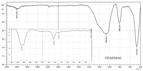 The PDADMAC adsorption mechanism is also supported by the FTIR spectrum of nanosilica after adsorption (Figure 10). The peaks of the functional group N–H of ammonium ions in PDADMAC molecules at 1473.62 cm−1 (Figure 10, inset spectrum) disappeared after adsorption onto nanosilica [54]. Furthermore, the peaks of 812.03 cm−1 assigned for symmetric Si–O (Figure 4) shifted to a shorter wavelength (806.25 cm–1), while bending modes at 470.63 cm–1 did not change after PDADMAC adsorption. The results demonstrate that PDADMAC molecules attached to the SiO2 surface through electrostatic attraction and hydrophobic interaction.