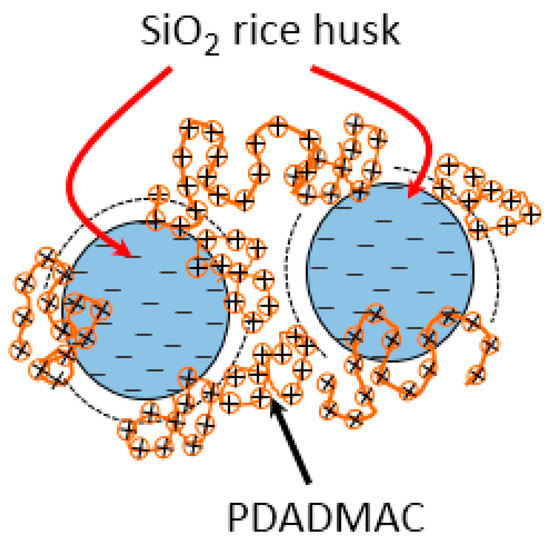 Cartoon representation of PDADMAC adsorption onto nanosilica rice husk.